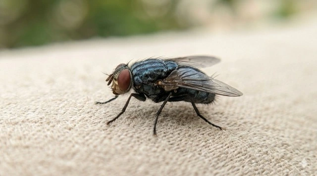 Deze vlieg is aanzienlijk groter dan de standaard kamervlieg en valt op door zijn glanzende, metallic blauwe achterlijf.